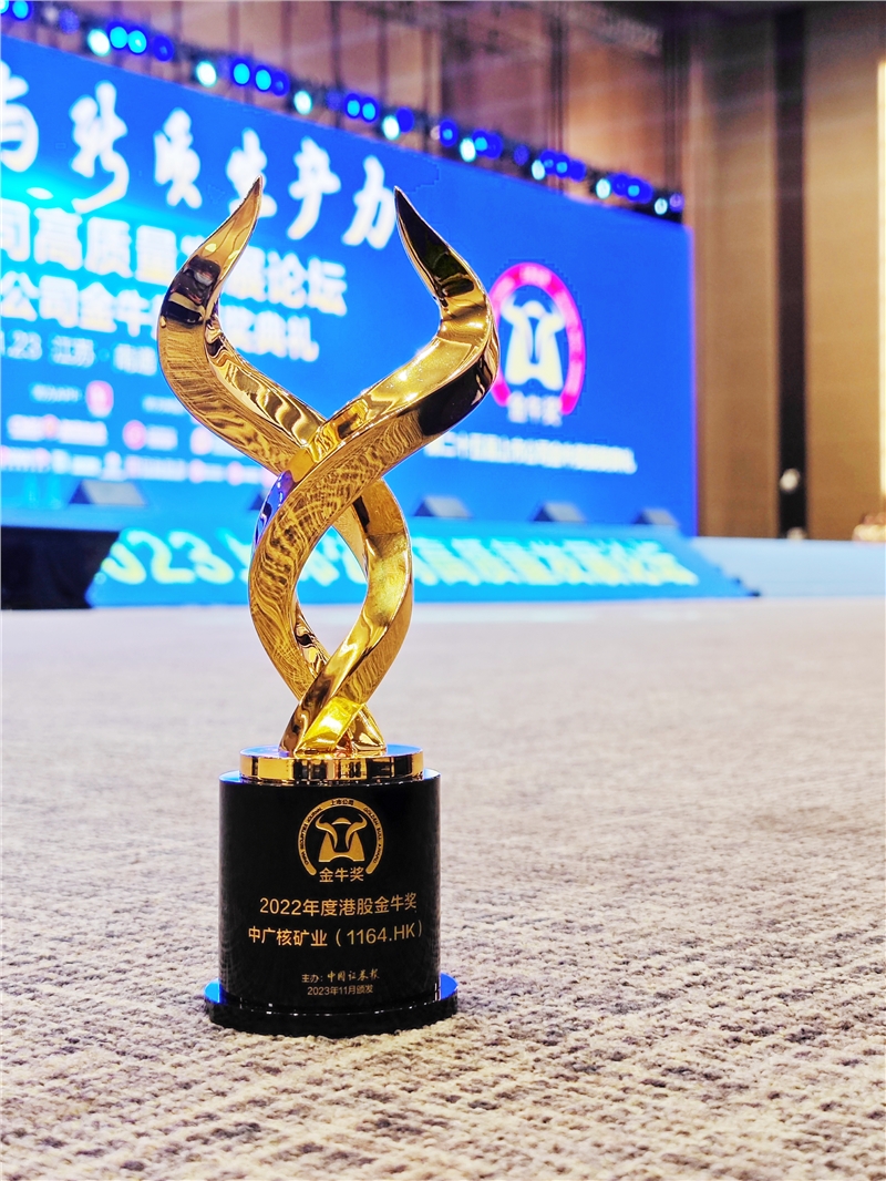 11月23日,2023中國上市公司高質量發展論壇暨第二十五屆上市公司金牛獎頒獎典禮在江蘇南通舉行。中廣核礦業榮獲“港股金牛獎”,公司董事會主席、首席執行官安軍靖出席頒獎典禮。